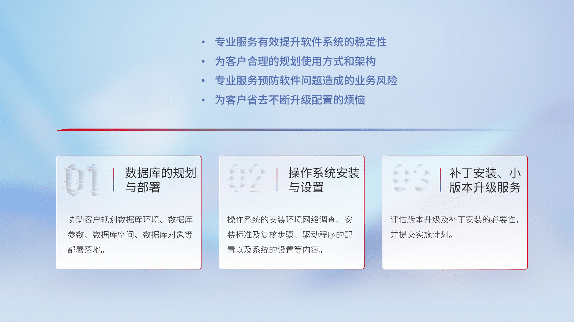 为客户提供软件规模升级、、、、快速部署、、、、按需配置的专业服务,,,,从数据库的规划与部署到操作系统的安装与设置,,再到补丁安装和小版本升级提供支持。。。。